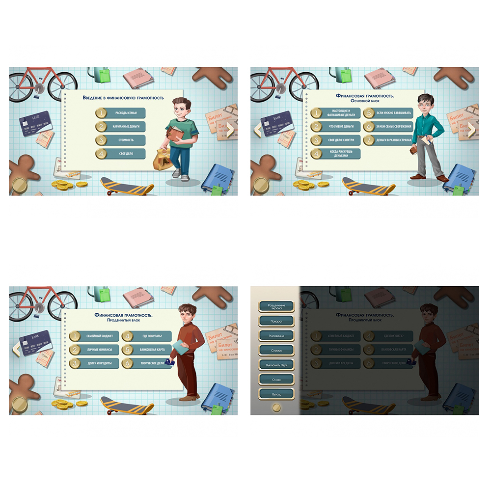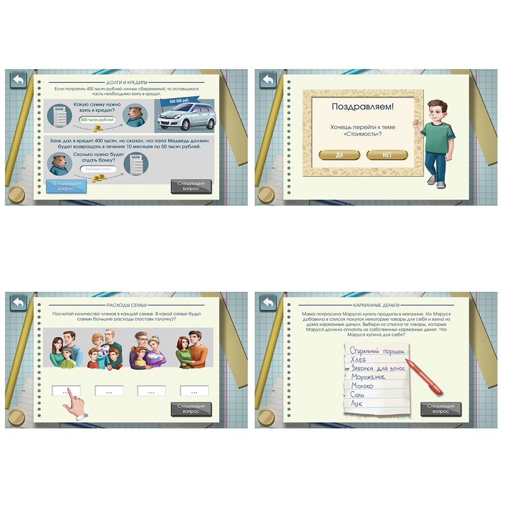 С этим программным обеспечением вы сможете обучить дисциплине «Финансовая грамотность» детей младшего и среднего школьного возраста (7-12 лет). ПО подходит для интерактивных панелей, столов, досок,  компьютеров и планшетов. Разработано с учётом нормативов Центрального Банка РФ.