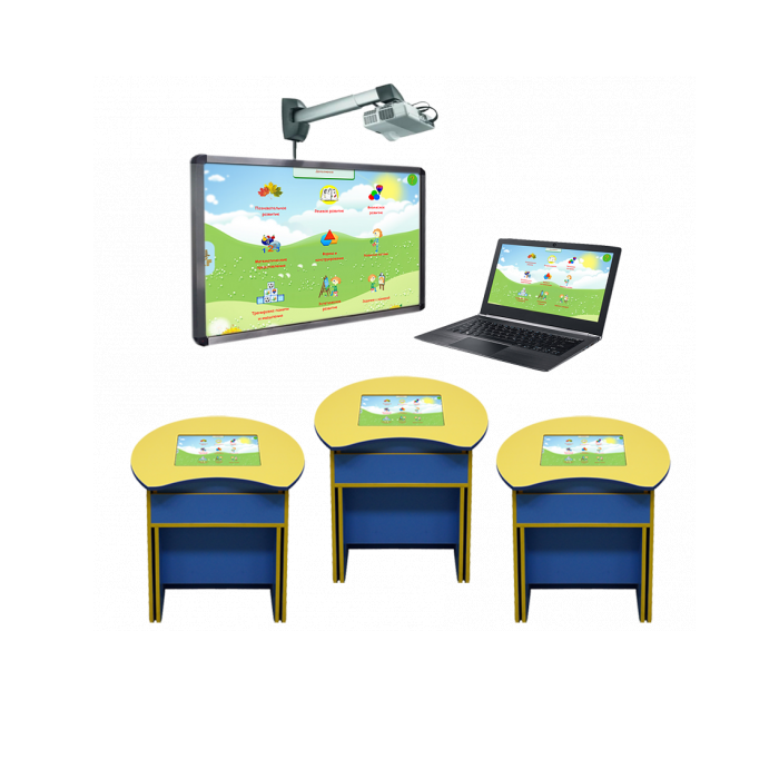 В состав такого интерактивного класса входят интерактивные парты (3 шт.), которые по сети Wi-Fi подключаются к ноутбуку/компьютеру педагога, проектору и к интерактивной доске. При этом получается настоящий интерактивный класс и открываются новые, уникальные возможности для проведения занятий!