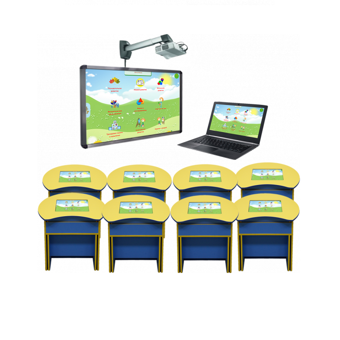 В состав такого интерактивного класса входят интерактивные парты (8 шт.), которые по сети Wi-Fi подключаются к ноутбуку/компьютеру педагога, проектору и к интерактивной доске. При этом получается настоящий интерактивный класс и открываются новые, уникальные возможности для проведения занятий!