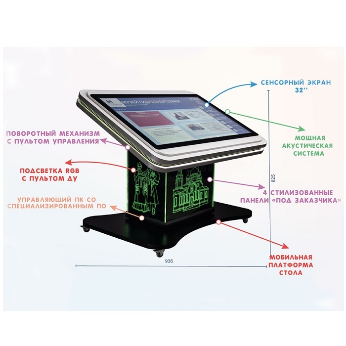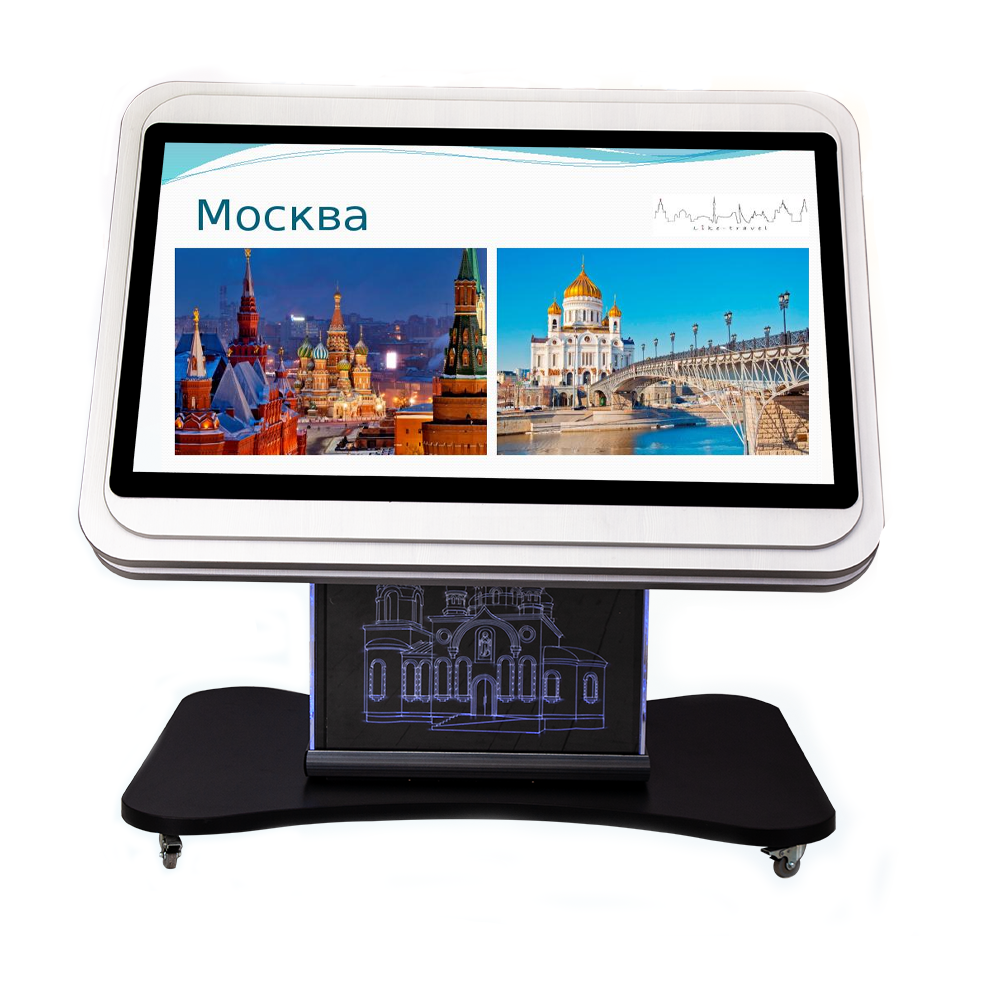 С помощью интерактивного мультимедийного стола легче подавать информацию детям и подросткам. Его диагональ позволяет работать как небольшим группам, так и одиночным посетителям. Так как интерактивный поворотный стол Laser имеет мобильную платформу-основание, то его можно легко перемещать и устанавливать в удобном месте.