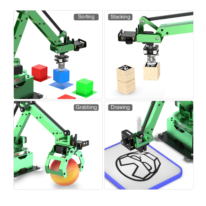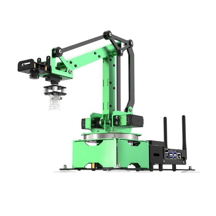Четырёхосевой учебный робот- манипулятор с модульными сменными насадками на базе NVIDIA Jetson Nano, использует роботизированную систему ROS и поддерживает программирование на языках C++, Python, Java, Java Script и др. включает в себя ресурсный набор для расширения возможностей изучения манипуляторной робототехники, позволяя так же изучить 2д и 3д моделирование, аддитивные технологии и технологию лазерной резки. Гироскоп используется в четырехосевом манипуляторе рычажного типа для измерения угловой скорости каждого из рычагов. Это позволяет определить положение и ориентацию манипулятора в пространстве. Полученные данные ориентации могут быть использованы для контроля движения манипулятора, обеспечения его стабильности и точности выполнения задач. Сменный лазерный модуль предназначен для добавления функциональности к манипулятору. Он позволяет выполнять точные и высококачественные операции по резке и гравировке различных материалов, таких как дерево, пластик, ткань, кожа, акрил и бумага. Роботизированный манипулятор с открытым исходным кодом, разработан на основе NVIDIA Jetson Nano. У него есть широкоугольная камера высокой четкости и интеллектуальные адресные сервоприводы. Он использует роботизированную систему ROS и поддерживает программирование на Python, С++, С# и др. Благодаря глубокому обучению и компьютерному зрению, способен выполнять множество задач, таких как распознавание цвета, сортировка мусора, распознавание жестов, распознавание лиц и определение наличия масок. С помощью мобильного приложения для Android/iOS, ПК, мыши и пульта дистанционного управления PS2 вы сможете управлять им легко и просто. Использует алгоритм обратной кинематики, обеспечивающий точное отслеживание, захват, сортировку и укладку цели. Он также предоставляет подробный анализ обратной кинематики, модели DH и предлагает исходный код для функции обратной кинематики. Благодаря открытому коду предустановленных программ, позволяет вам легко изучить компьютерное зрение роботов, обработку изображений, кинематику и другие аспекты робототехники, а также быстро воплотить различные творческие проекты в области искусственного интеллекта.
