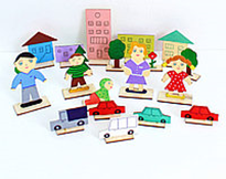 Набор выполнен из натурального дерева, что генетически откликается при работе с природным материалом. Имеет чёткий контур человека, машины, дома. Позволяет фантазировать и придумывать в песочнице разные образы и роли. В комплекте 20 фигурок на подставке. Окрашен в ручную художником.