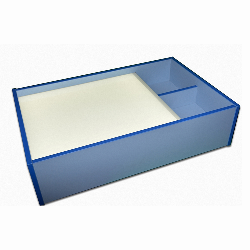 Стекло толщиной в 4 мм, используемое в планшете для песочной терапии, полностью порезобезопасное. Оно гарантирует высокую механическую прочность, термостойкость и покрывается плоттерной самоклеящейся поливинилхлоридной пленкой с полимерными пластификаторами, которые обеспечивают ровное окрашивание как при падающем, так и при проникающем освещении.