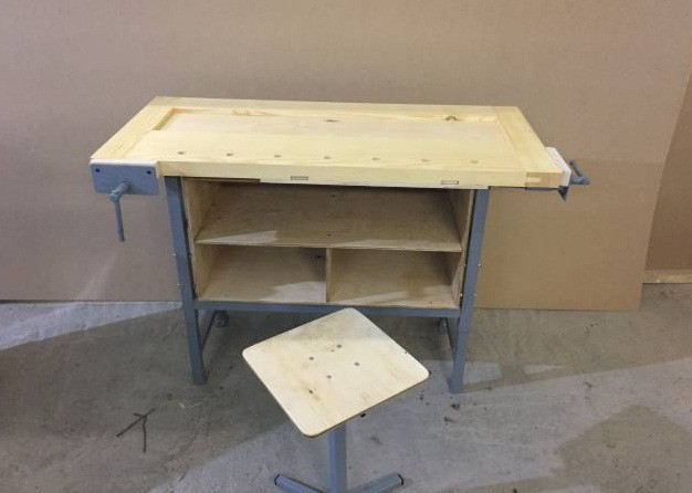 Верстак столярный с фиксированной регулировкой по высоте, в комплекте с табуретом и полками для заготовок и инстумента