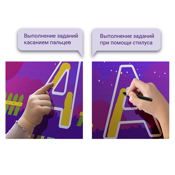 Занятия с сенсорным комплексом не требуют дополнительного использования ноутбука или компьютера. Управление игровыми сюжетами осуществляется непосредственным контактом пальцев с экраном сенсорной панели или стилусом. Для выполнения игровых заданий необходимо коснуться объекта, провести линию пальцем или стилусом на сенсорном экране, фиксировать положение, перемещать объекты. Корпус сенсорного экрана имеет наклон, обеспечивающий удобное взаимодействие с его элементами.