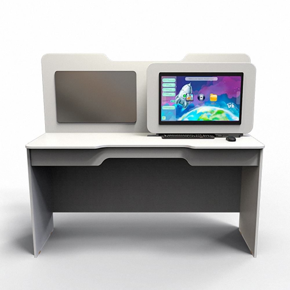 Функции профессионального логопедического стола «Logo EDU» определены симбиозом классической корпусной мебели, производительного компьютера, сенсорного экрана и программного обеспечения. За работу интерактивного комплекса отвечает производительный компьютер на базе: ЦП – Intel Celeron 3868U, ОЗУ – 4 Gb DDR-4-2133 и SSD накопителя – 120Gb. Картинка выводится на большой сенсорный 25 дюймовый экран с разрешением 1920х1080 точек и поддержкой до 10 касаний.