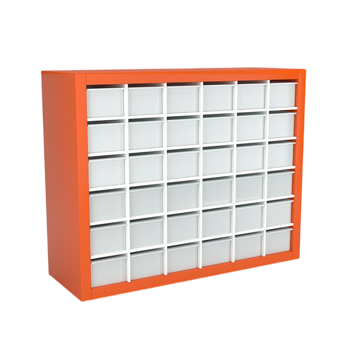 Объёмный, просторный стеллаж состоящий из 36 просторных пластиковых контейнеров. Отлично подходит для хранения мелких и крупных комплектующих, инструментов, поможет систематизировать все детали и сохранить порядок в кабинете и вещах учеников.