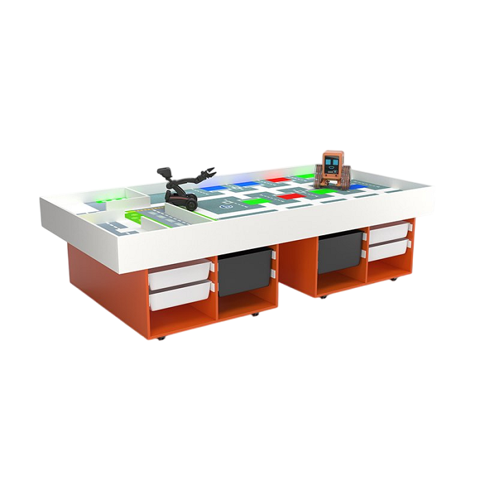 Данная модель стола отлично подойдёт для конструирования и испытаний. Стол оснащен игровой поверхностью и ящиками для хранения материалов и работ учащихся. А также в комплекте идет панель ПВХ с ярким дизайном для проведения демонстраций, которая точно привлечет внимание детей и вызовет интерес к работе. Стол подойдет для ежедневных занятий и для соревнований сконструированных роботов. Такой стол отлично подойдет для групповых занятий, так как имеет просторную поверхность и ученики смогут комфортно себя чувствовать во время занятия.