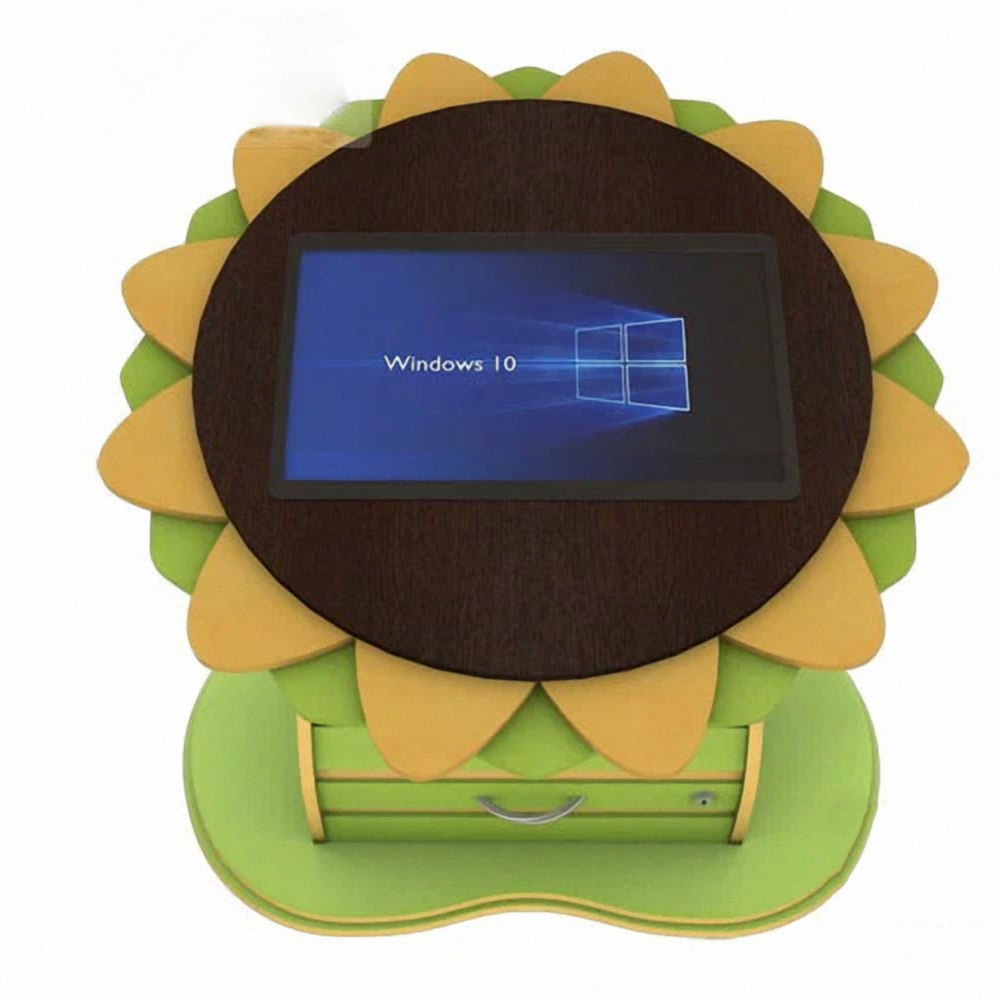 В комплектацию столика Подсолнух в обязательном порядке входят: ПК Intel Core i3 с видеокартой Intel HD Graphics, красочный корпус в виде подсолнуха, антивандальный сенсорный экран с диагональю 25” и разрешением 1920х1080 px, система коммуникаций и акустическая с выходной мощностью 6 Вт. В дополнение 340 развлекательных и обучающих программ. Устанавливать также можно и другие различные приложения совместимые с операционной системой Windows.