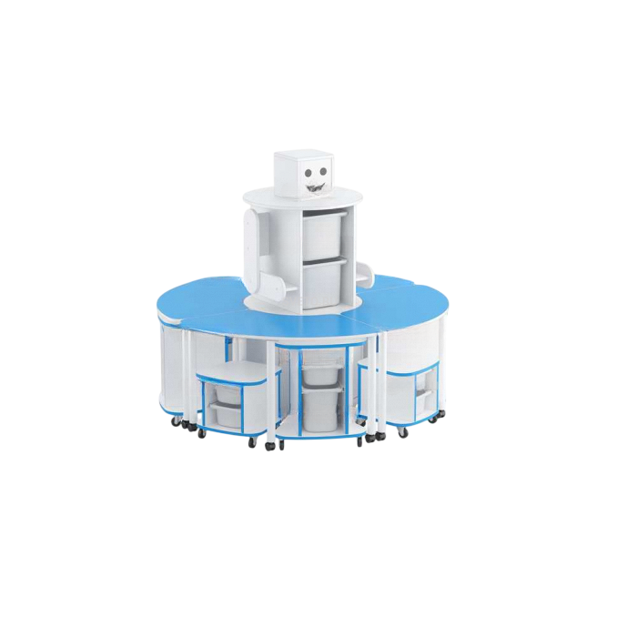 Главным преимуществом стеллажа «Робот-Робик» является его многофункциональность. Благодаря раздельным частям его можно трансформировать под любые нужды. Из нижней части собирается круглый стол, а посередине стоит Робик. Элементы конструкции также применимы в качестве отдельных тумб, которые можно разместить по углам. Наличие большого количества контейнеров позволяет сэкономить пространство и хранить необходимые материалы для занятий. «Робот-Робик» отлично подойдет для оформления игровых и развивающих зон.