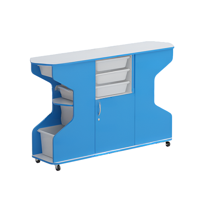 В средней части боковых секций закреплена фигурная полка, которая служит упором для столов на колёсиках: правого и левого.