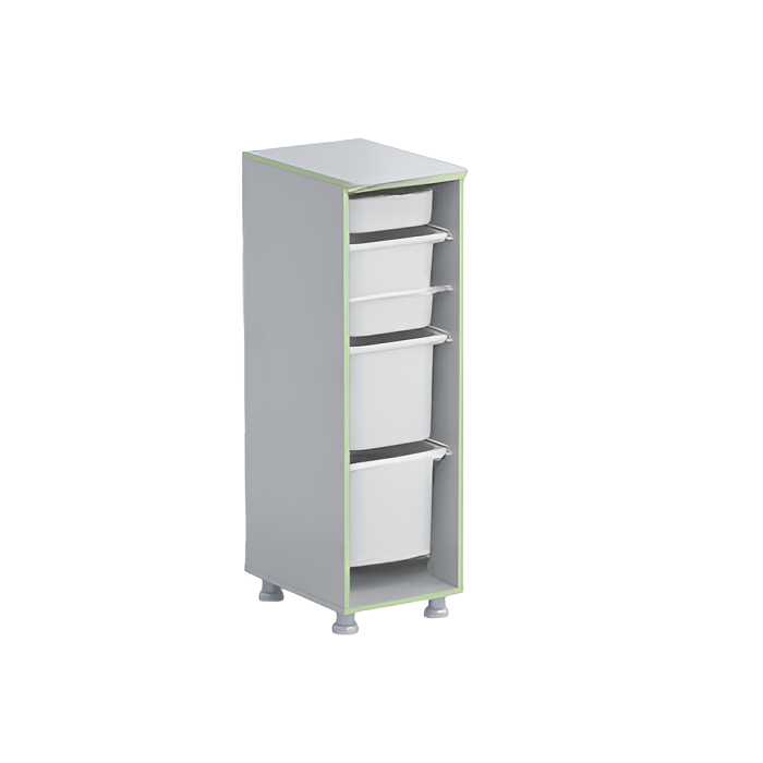 Стеллаж с лотками Робик 001 выполнен из ламинированной ДСП 16 мм, края обрамлены кантом ПВХ 2 мм. Внутреннее пространство стеллажа открыто.
