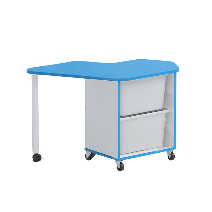 Стол детский левый Робик 002 выполнен из цветной ламинированной ДСП 16мм, кромки щитовых элементов облицованы кромочным пластиком толщиной 2 мм. Конструктивно стол выполнен в виде тумбы на колёсных опорах (две опоры с тормозом) и крышкой имеющей свес, поддерживаемый металлической опорой на колёсике. Внутри стола в открытой нише установлены два пластиковых лотка высотой по 230мм (длина лотка – 420 мм, ширина – 300 мм).