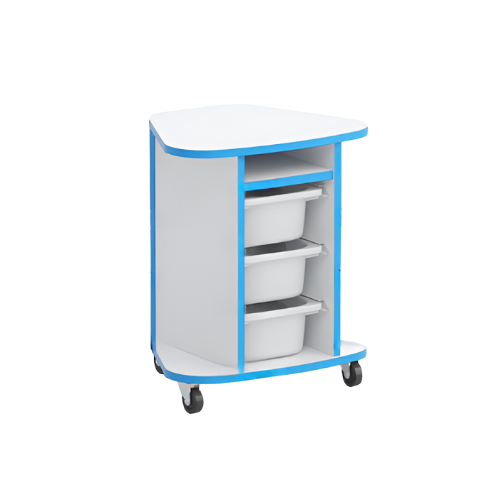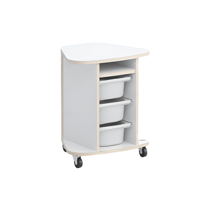Тумба Робик выполнена из ламинированной ДСП 16 мм, края обрамлены кромкой ПВХ 2 мм и установлена на 4 колеса (два колеса с тормозом). Крышка тумбы имеет форму сектора в 45 градусов от кольца. Углы крышки закруглены радиусом. В тумбе на направляющих установлены три пластиковых лотка высотой 100 мм (длина лотка – 210 мм, ширина – 300 мм). Над лотками имеется полочка.