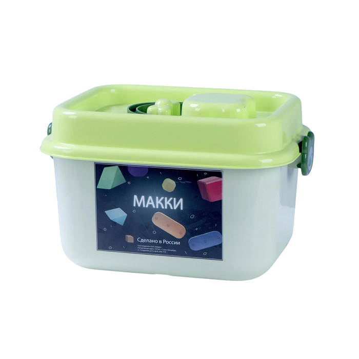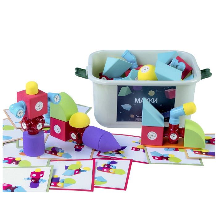 Конструктор «МАККИ 60» — набор цветных магнитных деталей, крупных геометрических фигур с магнитными креплениями. Детали конструктора окрашены в приятные однотонные цвета, со звуковым эффектом погремушки.