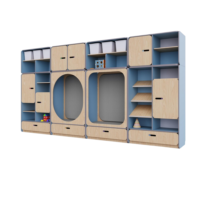 • Корпус изготовлен из экологичной березовой фанеры и ламинированной плиты. Эти материалы устойчивы к механическим воздействиям и влаге, что обеспечивает долговечность и безопасность их использования в детских учреждениях.