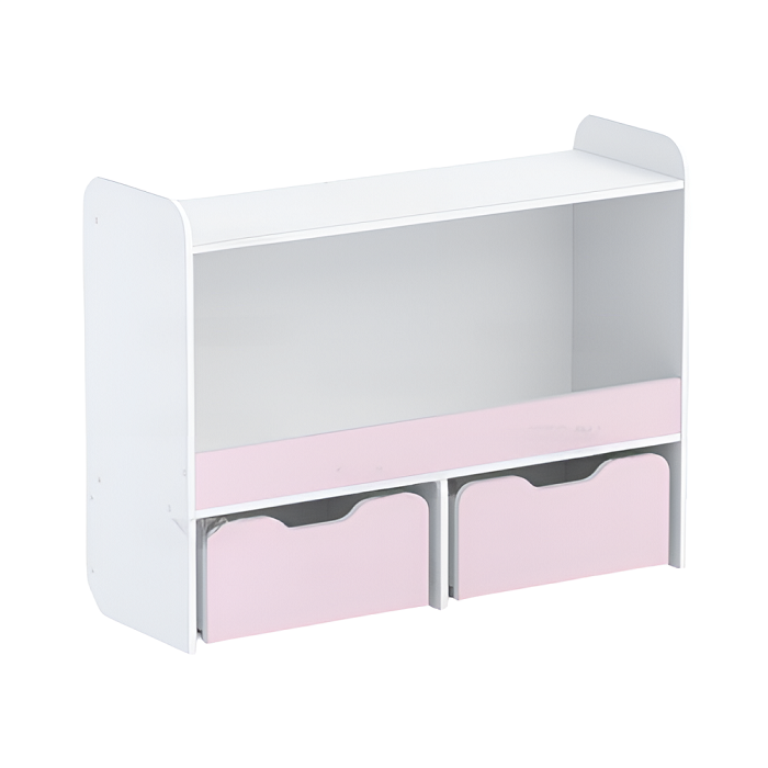 Стеллаж состоит из жестко скрепленной полками тумбы и двумя выдвижными ящиками.