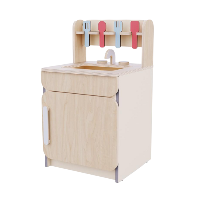 Широкая раковина предоставляет достаточно места для множества игровых сценариев, обеспечивая комфорт и удобство при игре. Оснащенная реалистичными деталями, такими как кран и поворотные кнопки, раковина создает ощущение настоящей кухни. В комплект входят столовые приборы, предназначенные для ролевых кулинарных игр. А встроенный шкаф с открывающейся дверцей позволит размещать все необходимое рядом с местом игры.