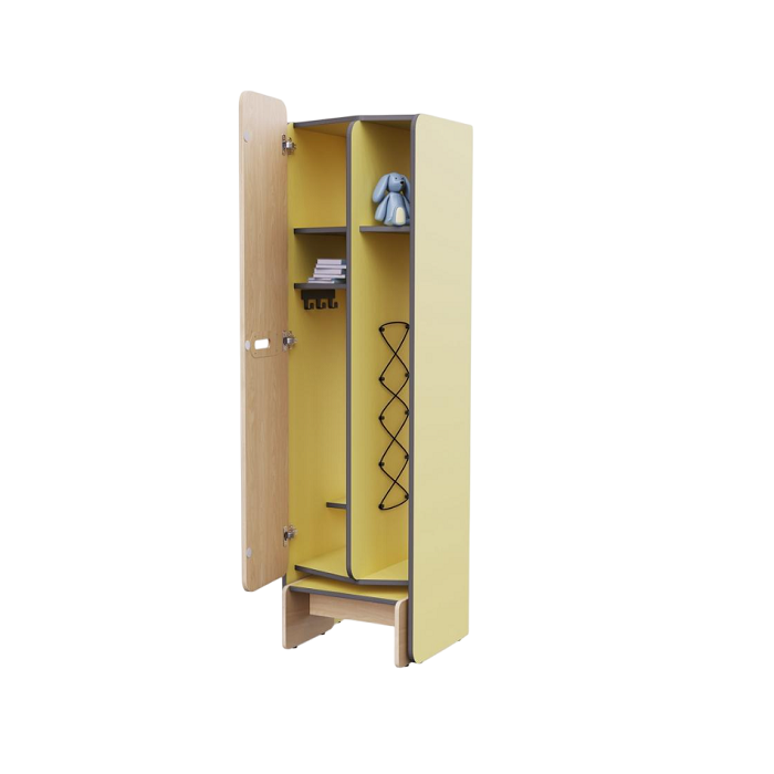 Детский шкаф-кабинка для хранения вещей и игрушек. Он разделён на две функциональные зоны: открытую - для верхней одежды, чтобы просушить её после прогулки в сырую погоду, и закрытую - для сменной одежды и обуви. Снизу шкафа идёт выдвижная скамейка. Предмет из коллекции мебели «НЕГА».