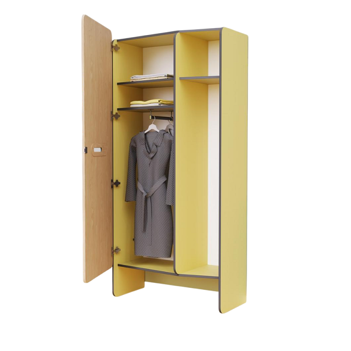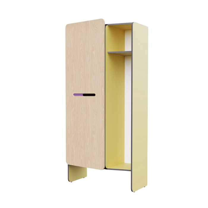 Дизайн шкафа позволяет выбирать сторону открывания дверей, а сохранность личных вещей обеспечивает наличие замка с ключами. Шкаф снабжен надёжными крючками и полками для одежды.