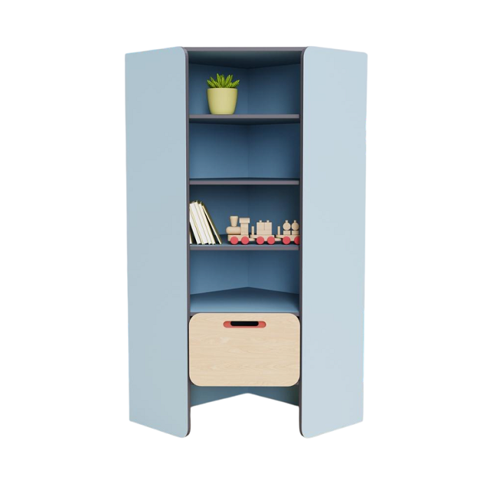 Угловой модуль для демонстрации детских работ. Оснащён глубокими полками для удобного размещения поделок воспитанников. Объединяет остальные модули из коллекции мебели «НЕГА» в единую композицию.