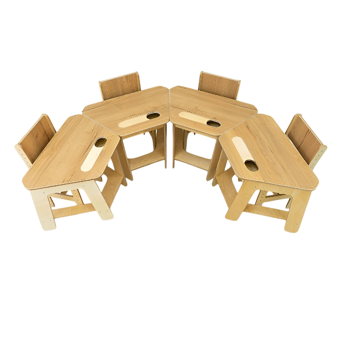 • «Детский стол» имеет форму трапеции. Необычный дизайн столешницы даёт возможность экспериментировать с расстановкой парт и позволяет максимально эффективно заполнять пространство в классе. Парты легко собираются в круг, линию или змейку, давая детям возможность взаимодействовать друг с другом. В столешнице предусмотрено отверстие под стаканчик с канцелярскими принадлежностями и полка для хранения мелочей, а снизу конструкции – опора для ног.