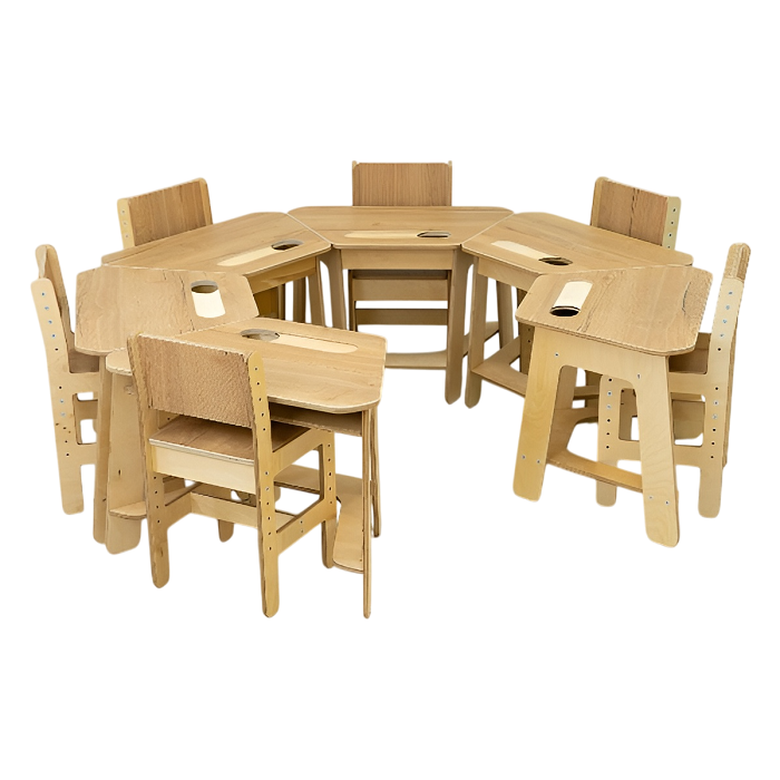 Комплекты столов в форме трапеции и растущих стульев для создания комфортной образовательной среды в ДОУ. Подходят для детей от 3 до 7 лет. Столы в форме трапеции группируются в различные композиции, максимально эргономично задействуя имеющиеся пространство класса. Растущие стулья учитывают анатомические и физиологические особенностей детей и позволяют менять высоту сидения и спинки под разный возраст.