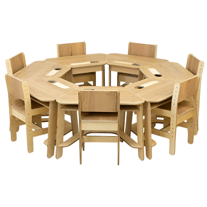 Комплекты столов в форме трапеции и растущих стульев для создания комфортной образовательной среды в ДОУ. Подходят для детей от 3 до 7 лет. Столы в форме трапеции группируются в различные композиции, максимально эргономично задействуя имеющиеся пространство класса. Растущие стулья учитывают анатомические и физиологические особенностей детей и позволяют менять высоту сидения и спинки под разный возраст.