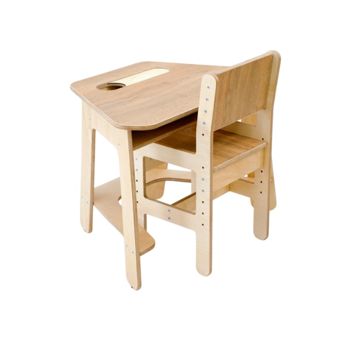 • «Детский стол» имеет форму трапеции. Необычный дизайн столешницы даёт возможность экспериментировать с расстановкой парт и позволяет максимально эффективно заполнять пространство в классе. Парты легко собираются в круг, линию или змейку, давая детям возможность взаимодействовать друг с другом. В столешнице предусмотрено отверстие под стаканчик с канцелярскими принадлежностями и полка для хранения мелочей, а снизу конструкции – опора для ног.