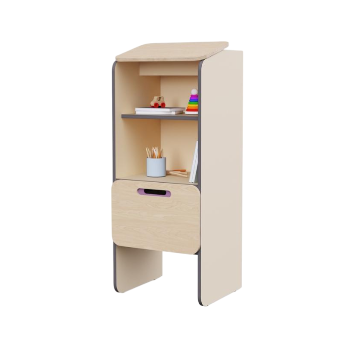 Шкаф-конторка для записей с наклонной верхней столешницей служит для ведения журналов приёма и передачи детей, а также заполнения необходимых документов. Конструкция эргономична для анатомии взрослого человека, и воспитателю будет удобно делать записи. Предмет из коллекции мебели «НЕГА».