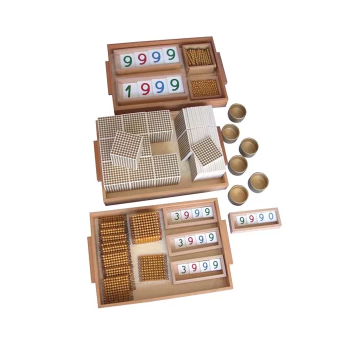 Впоследствии ребёнок учится производить все четыре математических  действия (в том числе и с переходом через разряд) с помощью «банка» «золотого» материала.