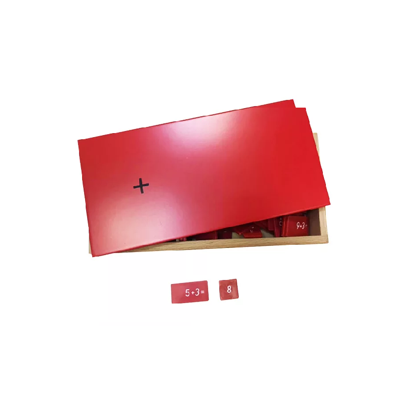В ящике находятся пластиковые таблички с примерами на сложение в пределах 20 и ответы к ним. Пользуясь любыми  материалами, ребёнок выполняет многочисленные примеры на сложение однозначных чисел, находит  и подставляет соответствующие таблички-ответы к примерам.
