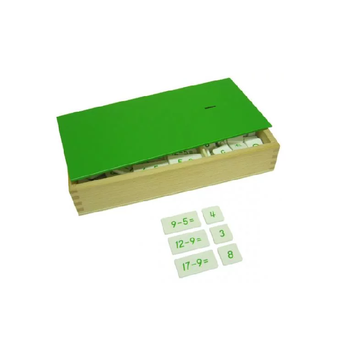 Ребёнок упражняется в решении примеров на вычитание, пользуясь любыми наглядными материалами или устно, и подставляет таблички-ответы. Для проверки используются контрольные карты «1» - на вычитание.