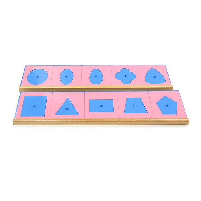 На двух синих деревянных подставках находятся 10 металлических розовых рамок (14х14 см) и соответствующие им синие вкладыши с разными фигурами.