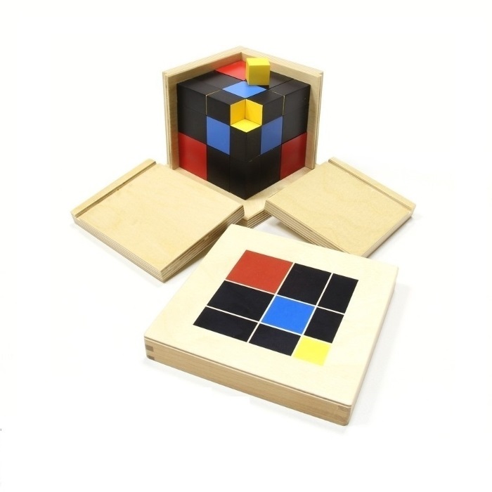 Триномиальный и биноминальный кубы – ребенок собирает биноминальный или триномиальный куб, сравнивая грани призм и кубиков, прикладывая их один к другому: красный – к красному, синий - к синему, черный – к черному. Чтобы получился исходный куб, ребенку приходится подбирать эти призмы и кубики еще и по размеру. Он вынужден тщательно анализировать собственные действия, что наилучшим образом способствует развитию детского мышления. Конкретное представление алгебраической формулы (a + b + c) в кубе.