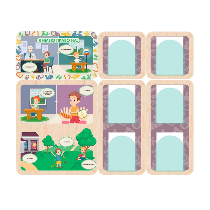 Панели информационных стендов выполнены из экологичной берёзовой фанеры, рисунок нанесён с помощью UF-печати стойкими к выцветанию красками, не имеющими неприятного запаха. Углы панели скруглены, крепления к стене скрыты декоративными заглушками для безопасности ребёнка. Стенды можно очищать сухой и влажной тканью.