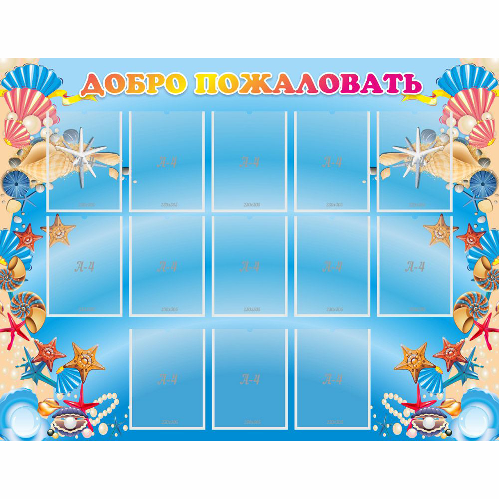 Темно-голубой фон морских глубин красиво оттеняет многочисленные карманы формата А4, в которых можно разместить фотографии детей и воспитателей, важные объявления, плакаты, списки групп, различные информационные листы о жизни детского сада. Вырез в верхнем краю карманов позволяет легко обновлять размещенную информацию. Картинка по краям дополняется красочными обитателями подводных глубин, которые обязательно привлекут внимание ребенка.