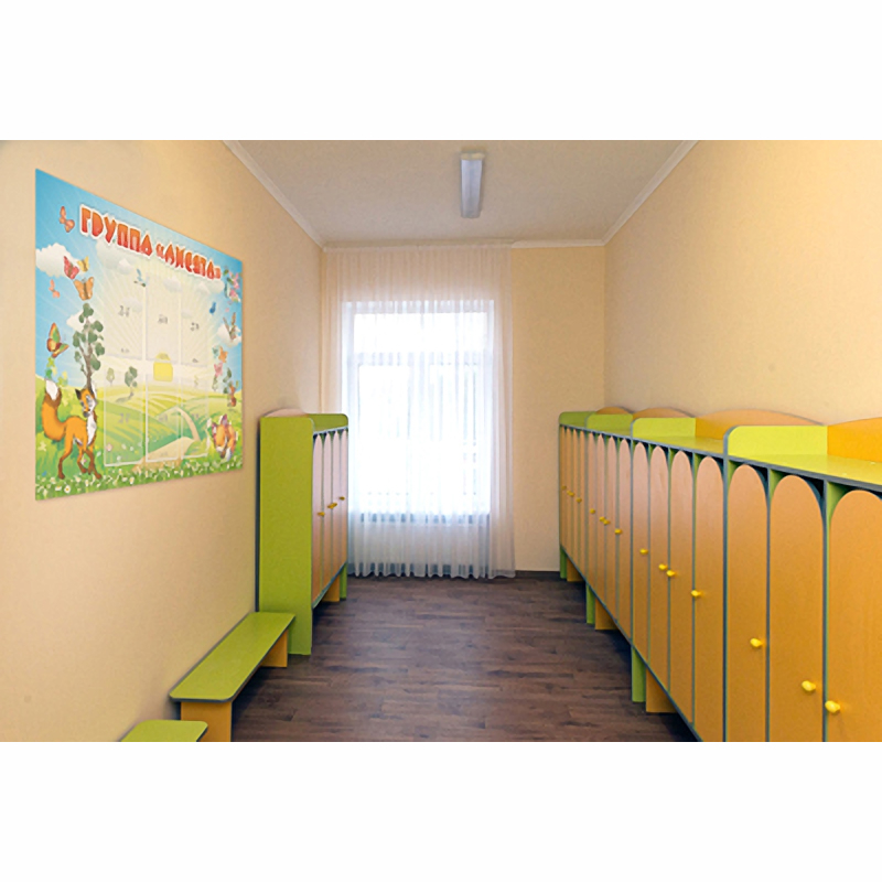 Озорные лисята вышли на прогулку. Извивается полевая дорога, в бесчисленных лучах солнца порхают разноцветные бабочки, а над всем этим великолепием выделяются ярко-красные буквы названия стенда. Трудно придумать лучшее украшение для помещения группы! А в шести прозрачных пластиковых карманах формата А4 можно с легкостью размещать и обновлять различные информационные листы - распорядок дня, списки детей, контакты воспитателей, правила посещения детского сада.