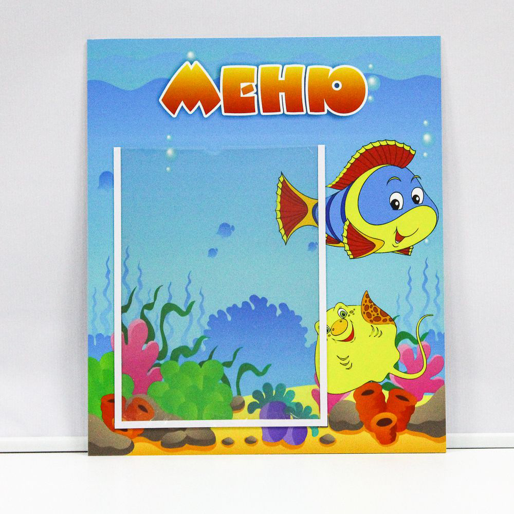 Стенд «Меню» расскажет родителям о том, что сегодня будут кушать дети в садике. Поэтому необходимо установить стенд непосредственно возле группы. Можно установить стенд на стене в раздевалке. Информационный карман выполнен из прозрачного пластика, имеет белые края. Главной идей дизайна является морская тематика. Дети увидят на стенде морское дно и его забавных обитетелей. Заголовок оформлен большими красно-оранжевыми буквами с границами белого цвета.