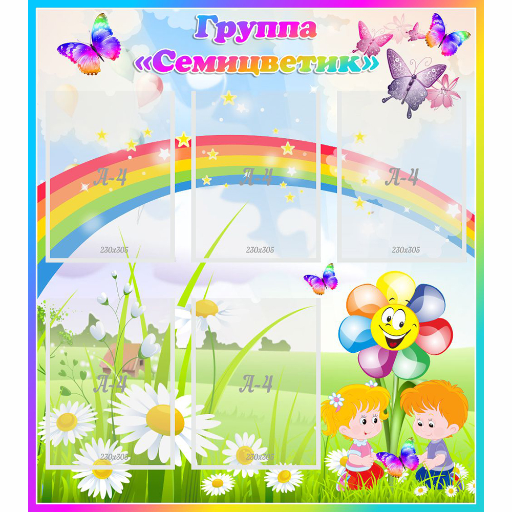 "Лети, лети, лепесток!" Добрая старая сказка возвращается к нам на красочном стенде. Волшебный цветок с разноцветными лепестками, радуга во все небо и множество ярких бабочек создают ощущение приближающегося волшебства. Такой стенд послужит украшением группы, а 5 прозрачных карманов позволяют разместить всевозможную информацию о жизни группы.
