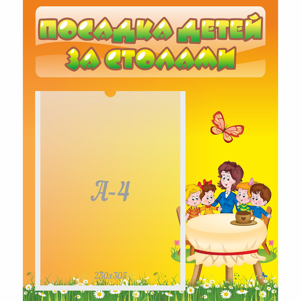 Схема посадки детей за столами помогает правильно подобрать мебель по росту, произвести посадку детей, что является профилактикой нарушения осанки и зрения. Информация на стенде определяет закрепление места за столами на определенный период. Эта схема по мере необходимости корректируется в зависимости от изменений в физическом состоянии детей в группе. Кармашек формата А4 позволяет своевременно заменять информационные листы.