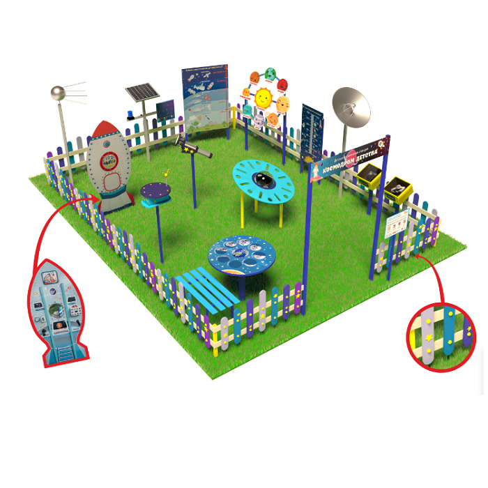 «Детская космическая станция» - это уличный комплекс, в состав которого входят красочные интерактивные стенды и макеты. С их помощью дети осваивают первые азы астрономии.