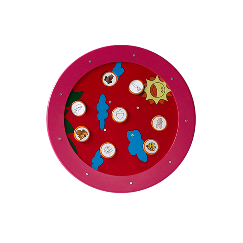 Игровой модуль представляет собой планшет в форме круга с расположенными на нём изображениями, образующими смысловые пары (собака - кость, заяц - морковка, белка - орешек, аквариум - рыбка). При нажатии на один из элементов пары появляется второй элемент. При вращении колеса игра сбрасывается и можно продолжать искать другие пары.