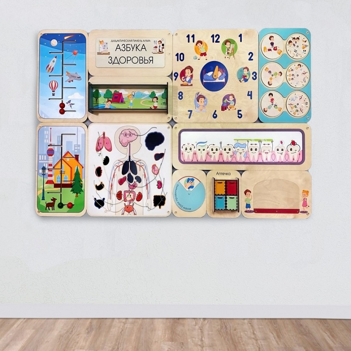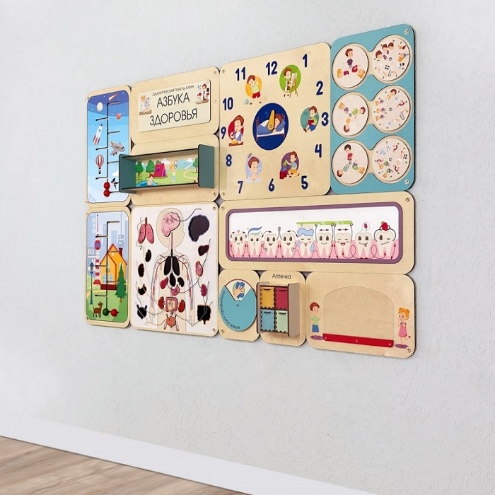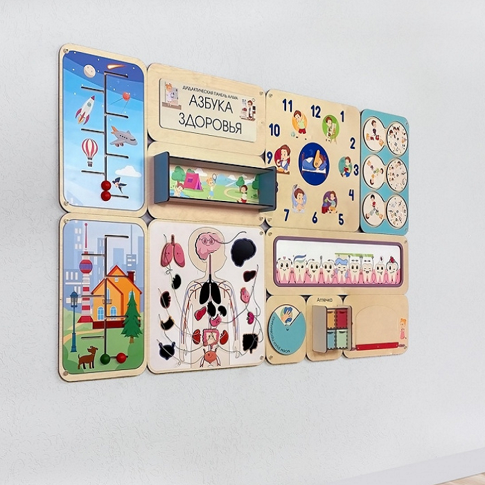 • Занятия с панелью «Азбука здоровья» нацелены познакомить детей со строением тела, фазами сна, уходом за зубами, первой медицинской помощью, тренировкой зрения.