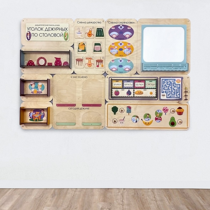 Главная Каталог Подготовительная группа и детский сад Сенсомоторное развитие Сенсорные панели для детей Дидактическая настенная панель «Уголок дежурных по столовой»