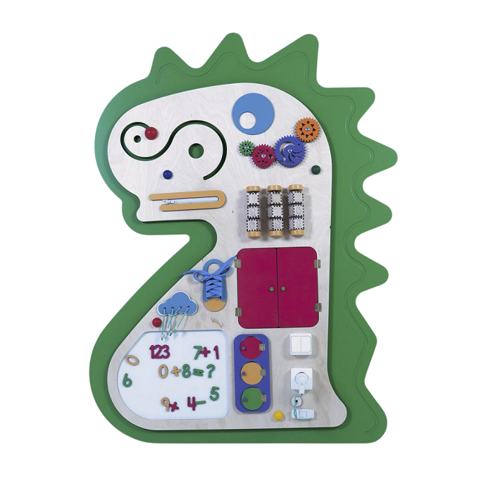 Бизиборд Крамп с изображением динозаврика по имени Крамп за счет своего цвета станет отличным настенным помощником.