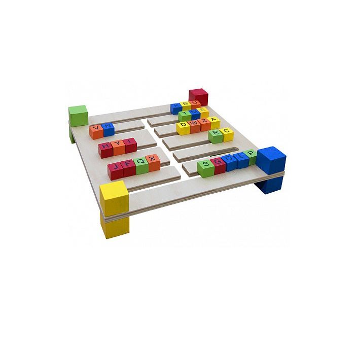 Представляет собой деревянную основу на цветных кубических опорах с прорезями для перемещения букв. Буквы размещены в прорезях на цветных кубиках, соединенных между собой попарно деревянной шпилькой.