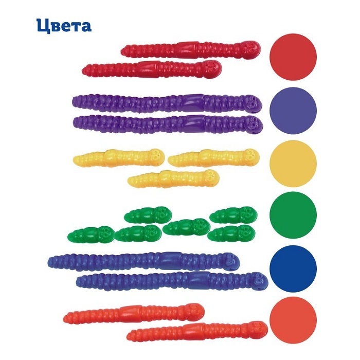 Эти гибкие, красочные червячки нужны для счета, сортировки и веселого измерения и сравнения. Набор включает в себя червячков в шести цветах и четырех размерах, длинной от 2,5 см до 10 см, руководство по использованию и удобное ведерко с завинчивающейся крышкой для хранения.