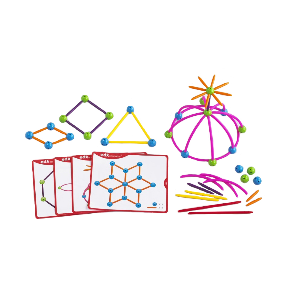 Этот конструктор для изучения основ математики не только улучшит мелкую моторику детей, он будет также развивать творческие навыки и навыки решения проблем, поощряя их построить двух и трехмерные структуры. Он знакомит детей с основными геометрическими формами. Набор включает в себя 80 палочек в 4-х размерах и 4-х цветов, 40 соединительных шаров в двух цветах, 24 квадранта и 20 двойных карточек, все в прочном контейнере.