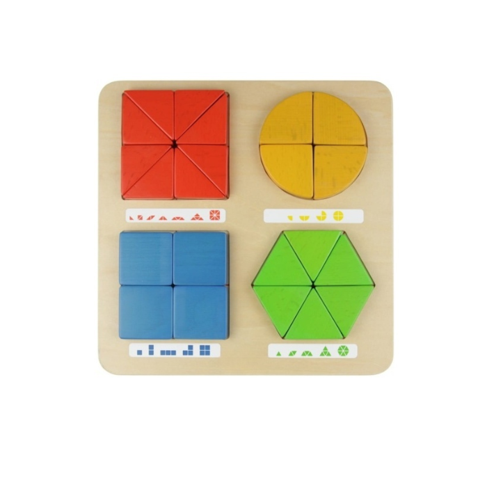 Панель представлена 4 разноцветными геометрическими фигурами, составленными из разного количества частей. С помощью подсказок, напечатанных на панели под каждой фигурой, дети узнают о композициях и разложениях некоторых геометрических фигур.